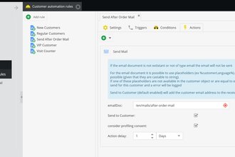 Sample marketing automation rule for sending mail 1 day after order is placed.